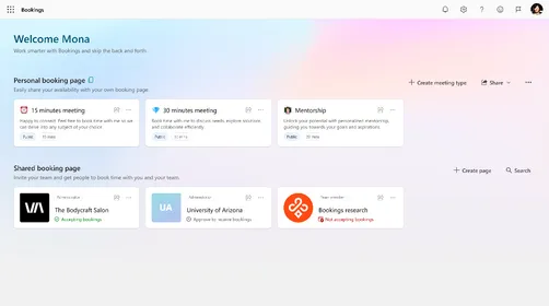 La nouvelle page d’accueil de Microsoft Bookings rassemble désormais en un seul endroit toutes vos réservations personnelles ainsi que celles partagées avec vos équipes. Fini les allers-retours : vous pouvez accéder, gérer et personnaliser toutes vos réunions depuis un espace unique, clair et ergonomique.